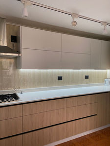 Elegancia y funcionalidad se unen en este diseño en color Nougat, complementado con muebles blanco lacado brillante (pintado a mano) y una cubierta de cuarzo blanco Galaxy, que aporta luminosidad y estilo.